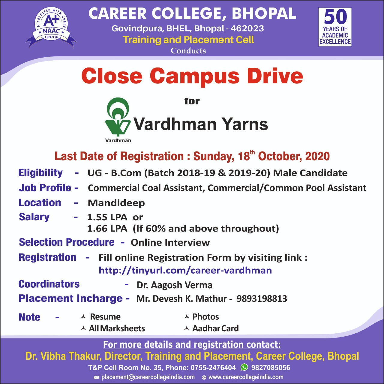 Vardhman Yarns is going to conduct an close campus drive with Career College. Last date for registration is 18th ,October, 2020. Registration link: *https://tinyurl.com/career-vardhman