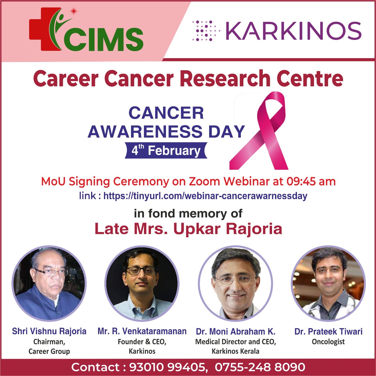 Dr Moni Abraham K, Medical Director, Karkinos, Kerala, Dr Prateek Tiwari, renowned oncologist and Mr. Manish Rajoria, Vice Chairman, Career Group will grace the occasion.