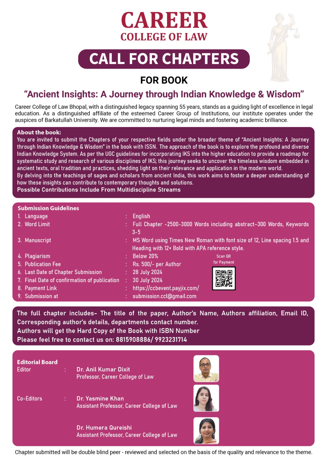 We are delighted to share that Career College of Law has come up with its Third consecutive edited book “Ancient Insights: A Journey through Indian Knowledge and Wisdom”.Dear authors are requested to contribute their valuable chapters for the book.